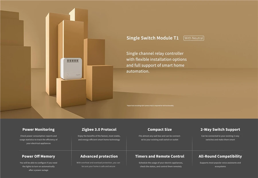 The Aqara Single Switch Module T1 (With Neutral) is a relay control module based on the Zigbee 3.0 wireless communication protocol, which can control the on/off status of the light, fan, and other devices. With the Aqara Hub, it can realize the remote control through the app (iOS/Android), timing control, power detection, power consumption statistics, etc., and can match other smart devices to realize more smart scenes.