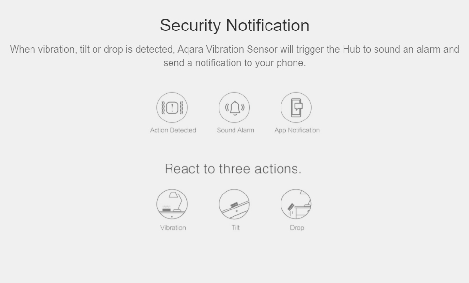 When vibration, tilt or drop is detected, Aqara Vibration Sensor will trigger the Hub to sound an alarm and