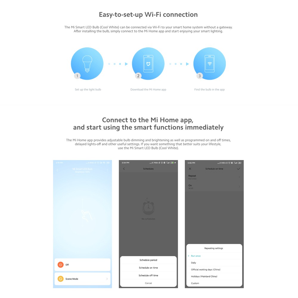 สามารถเชื่อมต่อผ่าน Wi-Fi ไปยังระบบสมาร์ทโฮมได้โดยไม่ต้องมีเกตเวย์ หลังจากติดตั้งหลอดไฟแล้วเพียงแค่เชื่อมต่อกับแอพ Mi Home และเริ่มเพลิดเพลินกับระบบไฟอัจฉริยะ